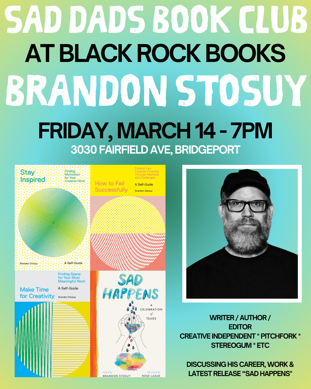We’re beyond excited to welcome back Brandon Stosuy to the Sad Dads Book Club for a special Q&A at Black Rock Books in Bridgeport, CT, on Friday, March 14, at 7 PM!